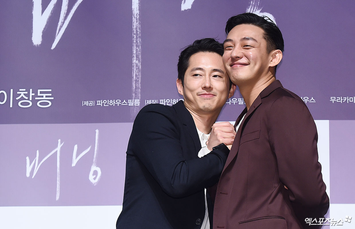 [엑스포츠뉴스 박지영 기자] 24일 오전 서울 신사동 CGV 압구정점에서 열린 영화 '버닝' 제작보고회에 참석한 배우 스티븐 연과 유아인이 포토타임을 갖고 있다.