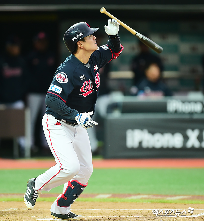 [엑스포츠뉴스 수원, 김한준 기자] 24일 오후 경기도 수원시 장안구 수원kt위즈파크에서 열린 '2018 신한은행 MY CAR KBO리그 롯데 자이언츠와 kt 위즈의 경기, 1회초 1사 2,3루 롯데 민병헌이 스리런 홈런을 날리고 있다.