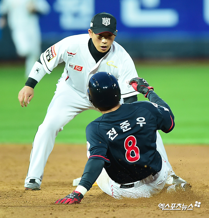 [엑스포츠뉴스 수원, 김한준 기자] 24일 오후 경기도 수원시 장안구 수원kt위즈파크에서 열린 '2018 신한은행 MY CAR KBO리그 롯데 자이언츠와 kt 위즈의 경기, 2회초 2사 1루 롯데 전준우가 2루 도루를 시도하다 kt 박경수에게 태그아웃을 당하고 있다.