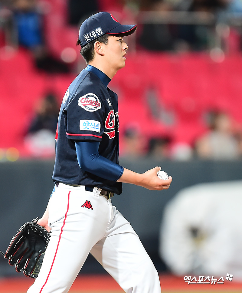 [엑스포츠뉴스 수원, 김한준 기자] 24일 오후 경기도 수원시 장안구 수원kt위즈파크에서 열린 '2018 신한은행 MY CAR KBO리그 롯데 자이언츠와 kt 위즈의 경기, 5회말 2사 만루 롯데 선발투수 김원중이 kt 윤석민에게 만루 홈런을 허용한 후 아쉬워하고 있다.