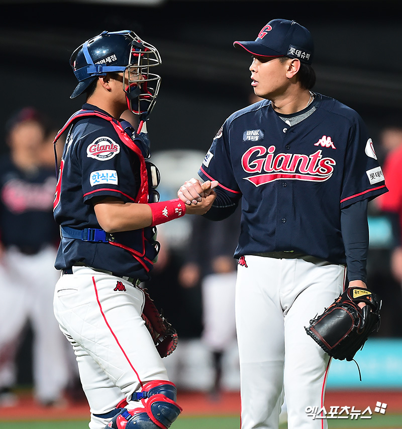 이날 경기에서 승리한 롯데 선수들이 하이파이브를 하고 있다.