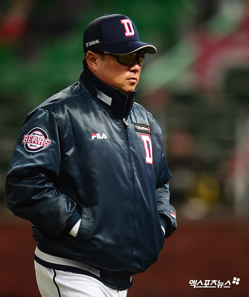 [엑스포츠뉴스 인천, 김한준 기자] 25일 오후 인천SK행복드림구장에서 열린 '2018 신한은행 MY CAR KBO리그' 두산 베어스와 SK 와이번스의 경기, 두산 김태형 감독이 선수교체를 알린 후 더그아웃으로 향하고 있다.