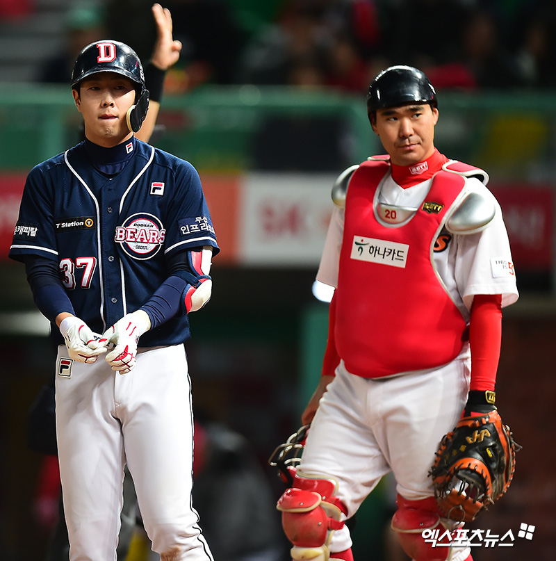 [엑스포츠뉴스 인천, 김한준 기자] 25일 오후 인천SK행복드림구장에서 열린 '2018 신한은행 MY CAR KBO리그' 두산 베어스와 SK 와이번스의 경기, 연장 10회초 2사 1,3루 두산 박건우가 고의사구로 출루하고 있다.
