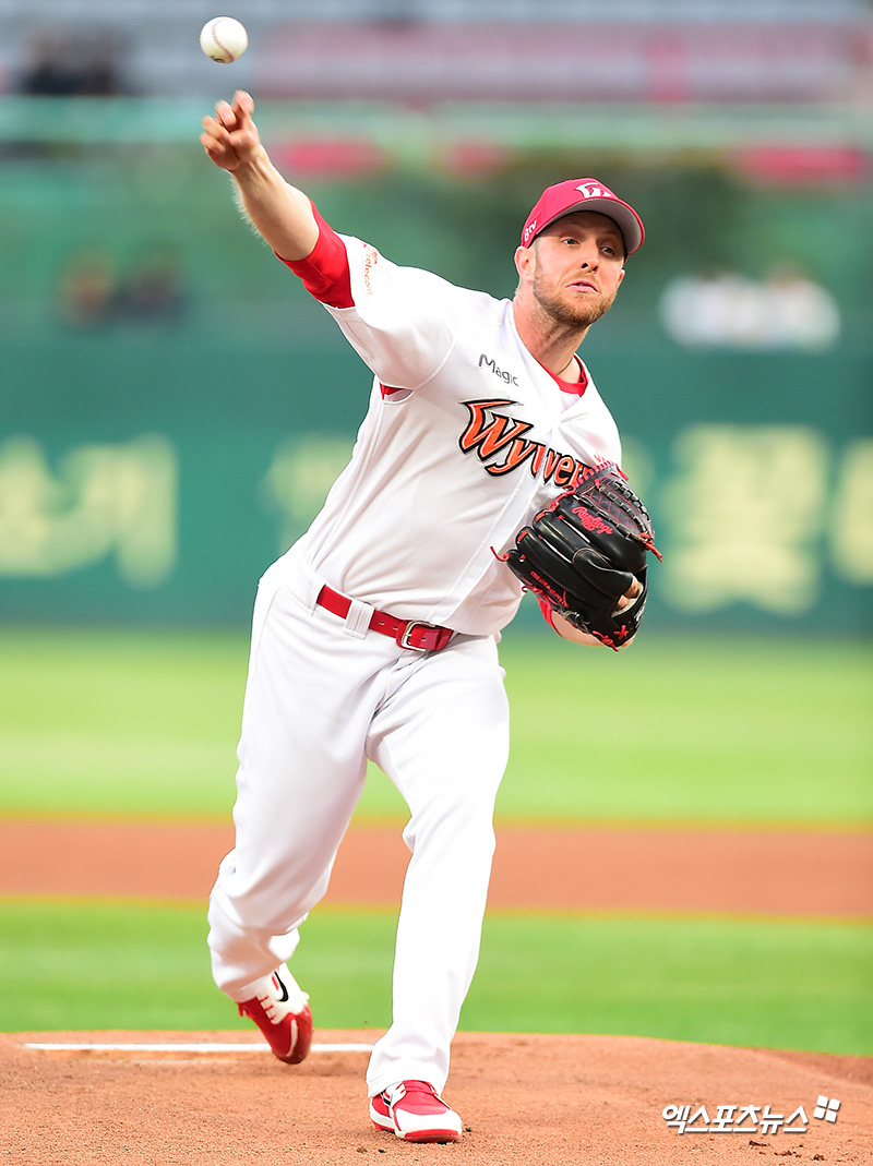 [엑스포츠뉴스 인천, 김한준 기자] 26일 오후 인천SK행복드림구장에서 열린 '2018 신한은행 MY CAR KBO리그' 두산 베어스와 SK 와이번스의 경기, 1회초 SK 선발투수 켈리가 공을 힘차게 던지고 있다.