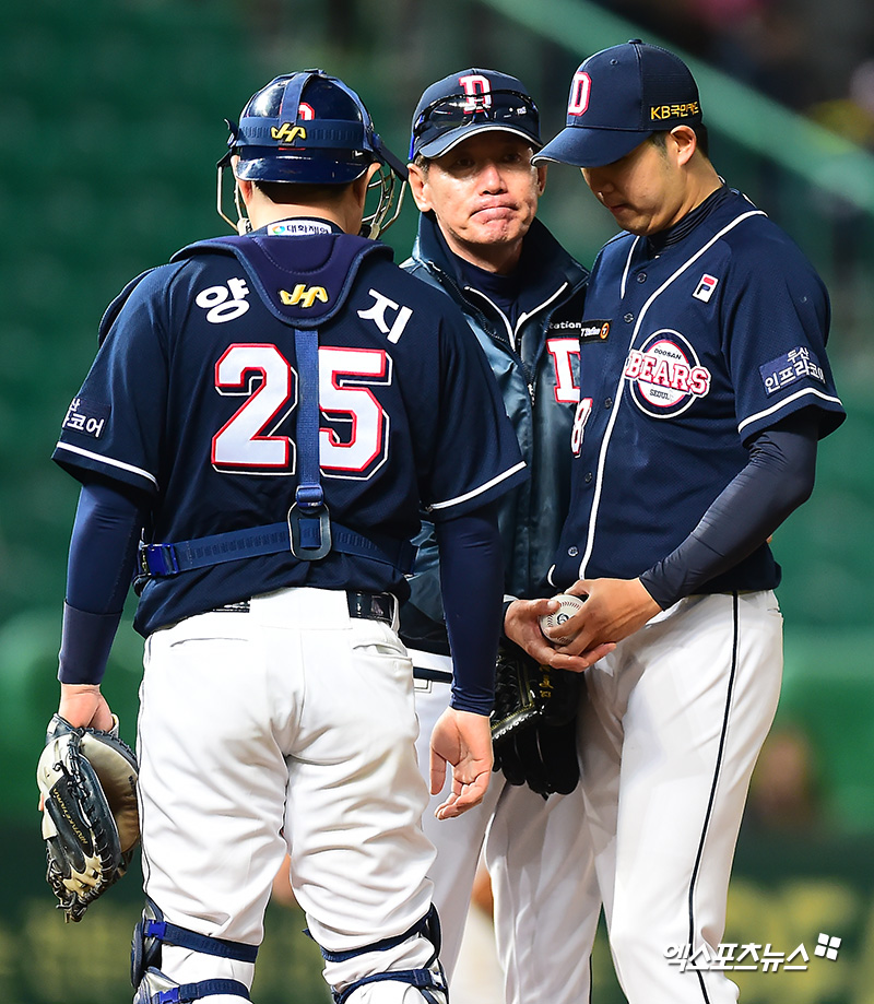 [엑스포츠뉴스 인천, 김한준 기자] 26일 오후 인천SK행복드림구장에서 열린 '2018 신한은행 MY CAR KBO리그' 두산 베어스와 SK 와이번스의 경기, 5회말 무사 1루 두산 선발투수 장원준이 마운드를 내려가고 있다.