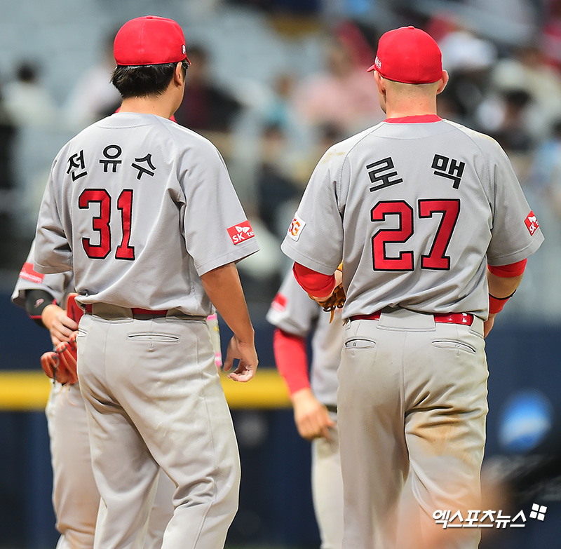 이날 경기에서 승리한 SK 선수들이 하이파이브를 하고 있다.