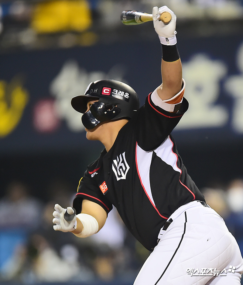 [엑스포츠뉴스 잠실, 김한준 기자] 1일 오후 서울 송파구 잠실야구장에서 열린 '2018 신한은행 MY CAR KBO리그' kt 위즈와 두산 베어스의 경기, 4회초 kt 황재균이 솔로 홈런을 날리고 있다.