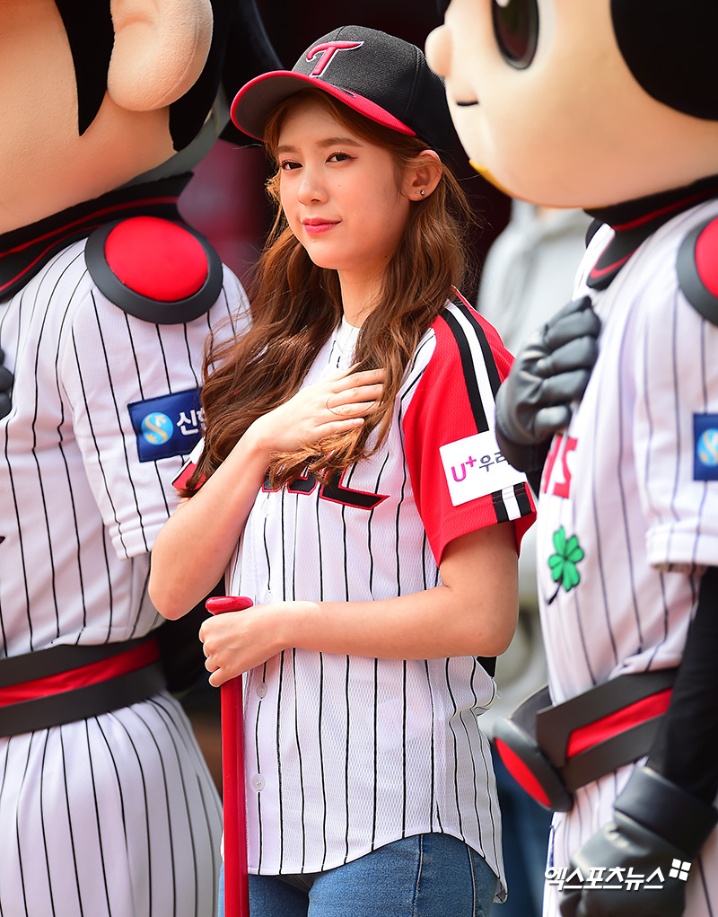 [엑스포츠뉴스 잠실, 김한준 기자] 5일 오후 서울 송파구 잠실야구장에서 열린 '2018 신한은행 MY CAR KBO리그 두산 베어스와 LG 트윈스의 경기, 모모랜드 데이지가 시타 전 국민의례를 하고 있다.