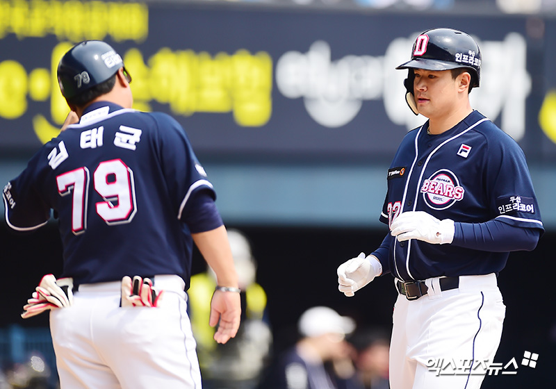 [엑스포츠뉴스 잠실, 김한준 기자] 5일 오후 서울 송파구 잠실야구장에서 열린 '2018 신한은행 MY CAR KBO리그 두산 베어스와 LG 트윈스의 경기, 1회초 2사 2루 두산 김재환이 투런 홈런을 날린 후 김태균 코치와 하이파이브를 하고 있다.