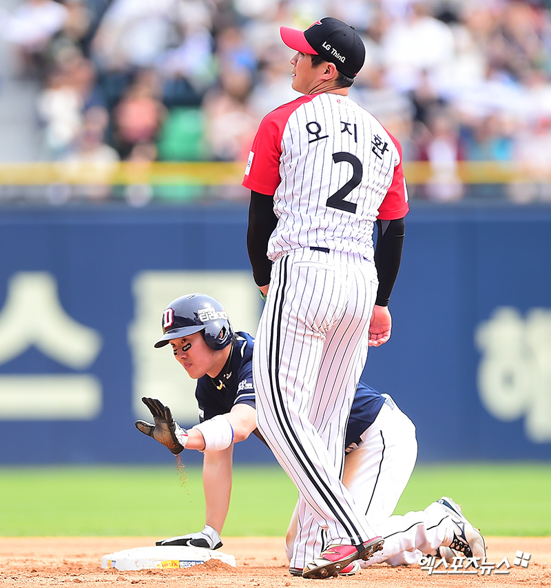 [엑스포츠뉴스 잠실, 김한준 기자] 5일 오후 서울 송파구 잠실야구장에서 열린 '2018 신한은행 MY CAR KBO리그 두산 베어스와 LG 트윈스의 경기, 4회초 2사 1루 두산 허경민이 2루 도루에 성공한 후 타임을 요청하고 있다.