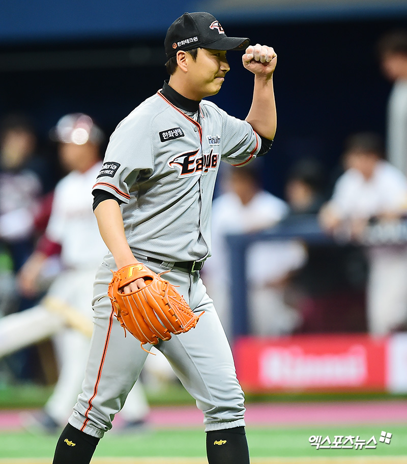 이날 경기에서 승리한 한화 정우람이 기뻐하고 있다.
