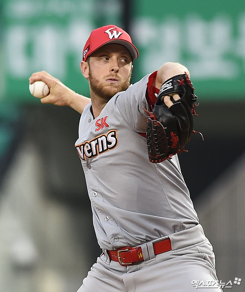 [엑스포츠뉴스 잠실, 박지영 기자] 15일 오후 서울 송파구 잠실야구장에서 열린 '2018 신한은행 MY CAR KBO리그' SK 와이번스와 두산 베어스의 경기, 1회말 무사 SK 선발투수 켈리가 역투하고 있다.