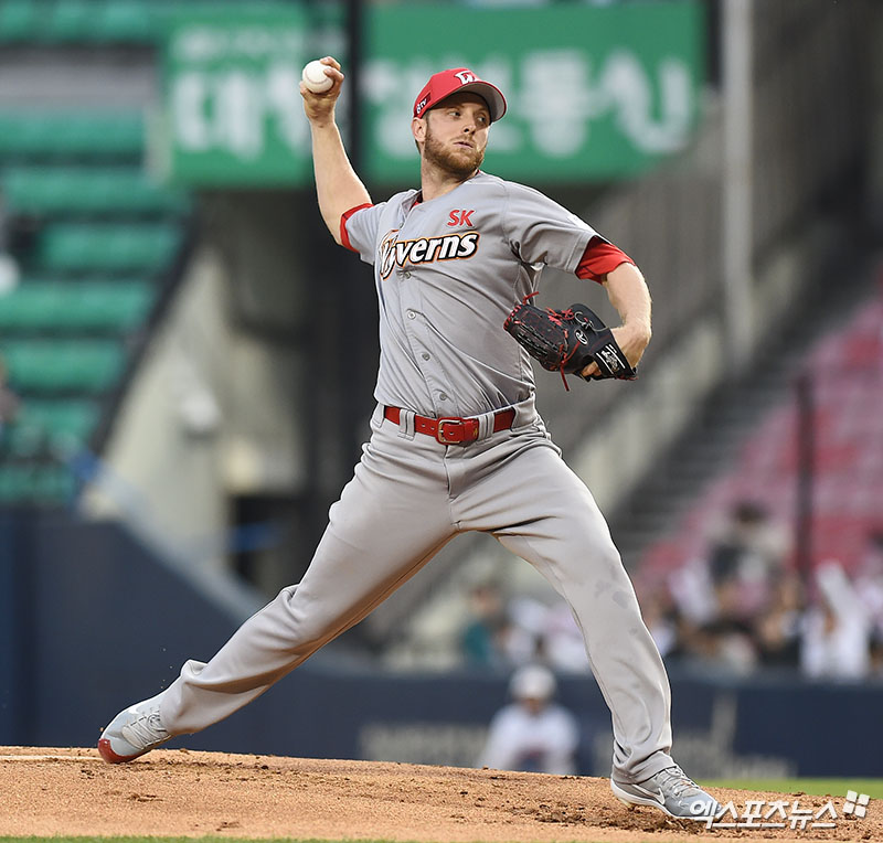 [엑스포츠뉴스 잠실, 박지영 기자] 15일 오후 서울 송파구 잠실야구장에서 열린 '2018 신한은행 MY CAR KBO리그' SK 와이번스와 두산 베어스의 경기, 1회말 무사 SK 선발투수 켈리가 역투하고 있다.