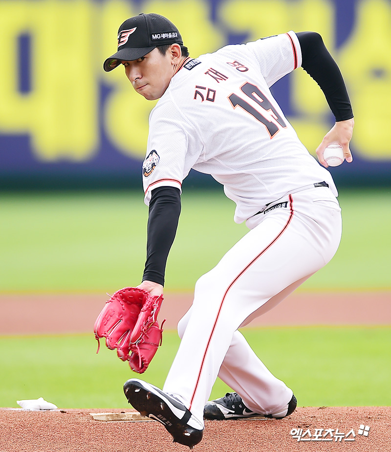 [엑스포츠뉴스 대전, 김한준 기자] 22일 오후 대전광역시 중구 한화생명이글스파크에서 열린 '2018 신한은행 MY CAR KBO리그' 두산 베어스와 한화 이글스의 경기, 1회초 한화 선발투수 김재영이 공을 힘차게 던지고 있다.