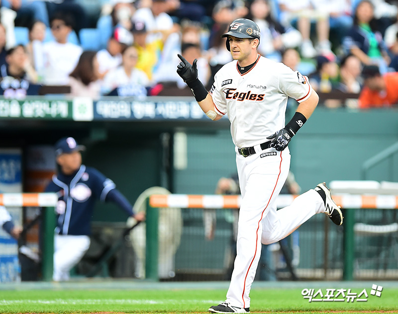 [엑스포츠뉴스 대전, 김한준 기자] 22일 오후 대전광역시 중구 한화생명이글스파크에서 열린 '2018 신한은행 MY CAR KBO리그' 두산 베어스와 한화 이글스의 경기, 3회말 2사 1루 한화 호잉이 투런 홈런을 날린 후 그라운드를 돌고 있다.