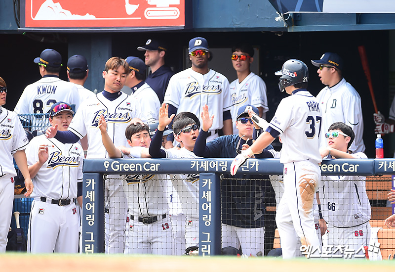 [엑스포츠뉴스 잠실, 김한준 기자] 27일 오후 서울 송파구 잠실야구장에서 열린 '2018 신한은행 MY CAR KBO리그' 삼성 라이온즈와 두산 베어스의 경기, 1회말 1사 1,2루 두산 박건우가 김재환의 2타점 2루타때 득점에 성공한 후 더그아웃에서 하이파이브를 하고 있다.