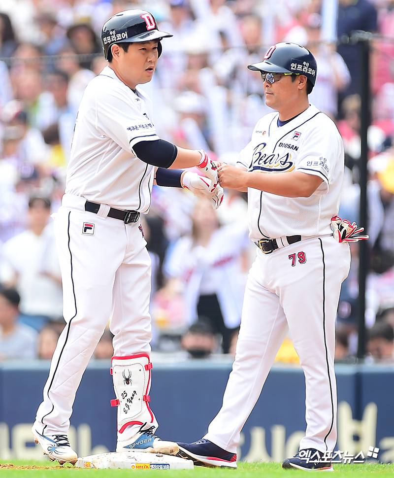 [엑스포츠뉴스 잠실, 김한준 기자] 27일 오후 서울 송파구 잠실야구장에서 열린 '2018 신한은행 MY CAR KBO리그' 삼성 라이온즈와 두산 베어스의 경기, 1회말 1사 2루 두산 양의지가 우전안타를 날린 후 김태균 코치와 하이파이브를 하고 있다.