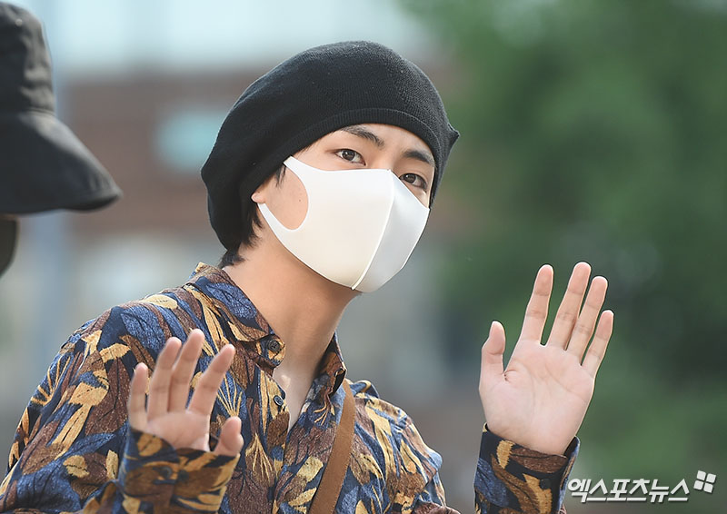 [엑스포츠뉴스 박지영 기자] 1일 오전 서울 여의도동 KBS 신관 공개홀에서 진행된 KBS '뮤직뱅크' 리허설에 참석한 방탄소년단 뷔가 출근길에 포즈를 취하고 있다.
