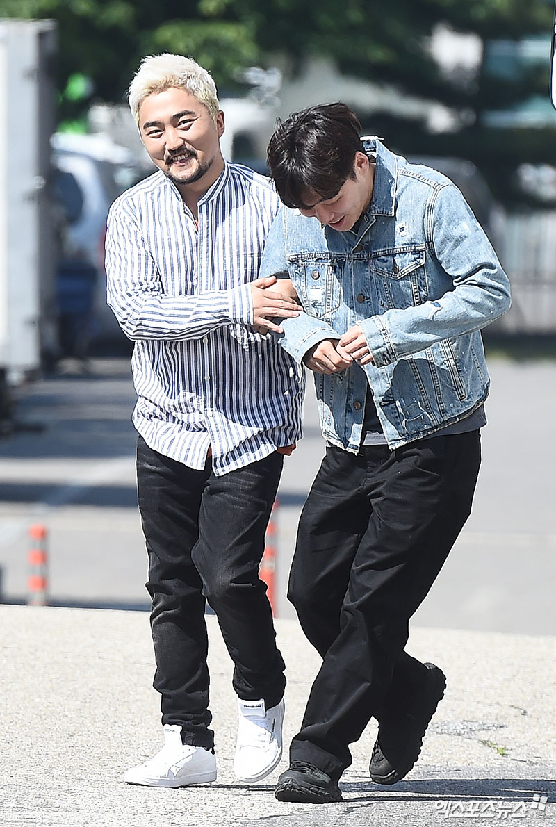 [엑스포츠뉴스 박지영 기자] 2일 오전 서울 여의도동 KBS별관에서 진행된 KBS2 '해피투게더3' 리허설에 참석한 개그맨 유병재가 매니저 유규선과 함께 출근길에 포즈를 취하고 있다.
