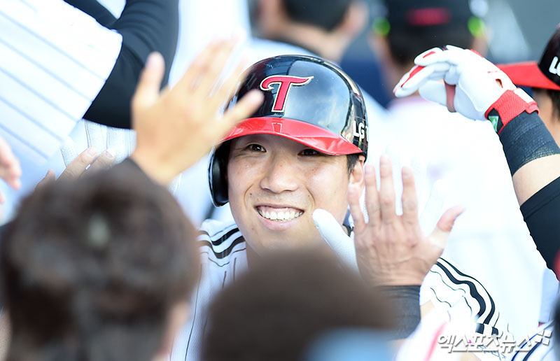 [엑스포츠뉴스 박지영 기자] 2일 오후 서울 송파구 잠실야구장에서 열린 '2018 신한은행 MY CAR KBO리그' 넥센 히어로즈와 LG 트윈스의 경기, 2회말 무사 LG 김현수가 솔로 홈런을 때려낸 뒤 더그아웃에서 동료들과 하이파이브를 나누고 있다.