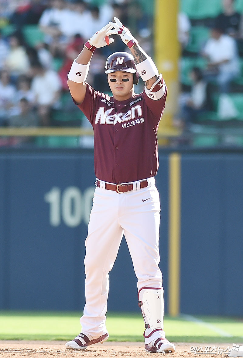 [엑스포츠뉴스 박지영 기자] 2일 오후 서울 송파구 잠실야구장에서 열린 '2018 신한은행 MY CAR KBO리그' 넥센 히어로즈와 LG 트윈스의 경기, 1회초 1사 1,3루 넥센 박병호가 적시타를 때려낸 뒤 1루에서 세리머니를 하고 있다.