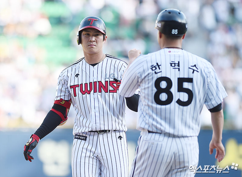 [엑스포츠뉴스 잠실, 박지영 기자] 2일 오후 서울 송파구 잠실야구장에서 열린 '2018 신한은행 MY CAR KBO리그' 넥센 히어로즈와 LG 트윈스의 경기, 3회말 1사 1,3루 LG 오지환이 적시타를 때려낸 뒤 1루에서 한혁수 코치와 주먹을 맞대고 있다.