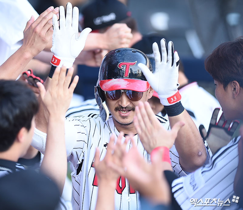 [엑스포츠뉴스 잠실, 박지영 기자] 2일 오후 서울 송파구 잠실야구장에서 열린 '2018 신한은행 MY CAR KBO리그' 넥센 히어로즈와 LG 트윈스의 경기, 4회말 1사 1루 LG 박용택이 우월 투런 홈런을 때려낸 뒤 더그아웃에서 동료들에게 축하를 받고 있다.