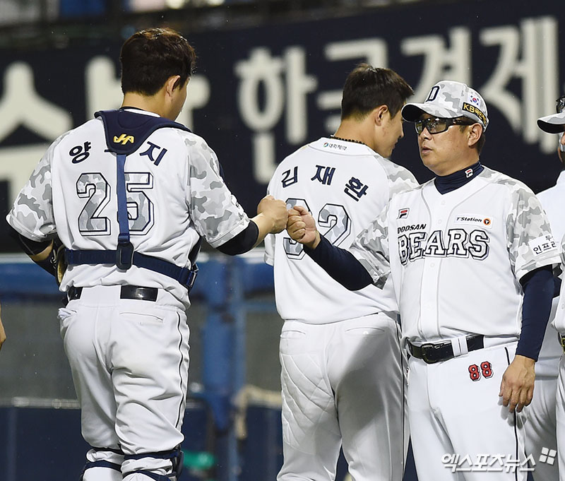 경기 종료 후 두산 김태형 감독이 선수들과 하이파이브를 나누고 있다.