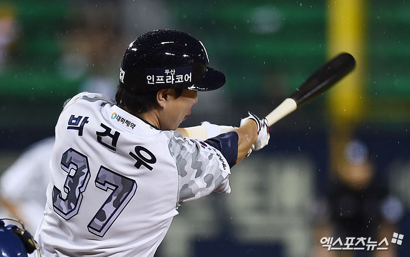 8회말 2사 3루 두산 박건우가 적시타를 때려내고 있다.