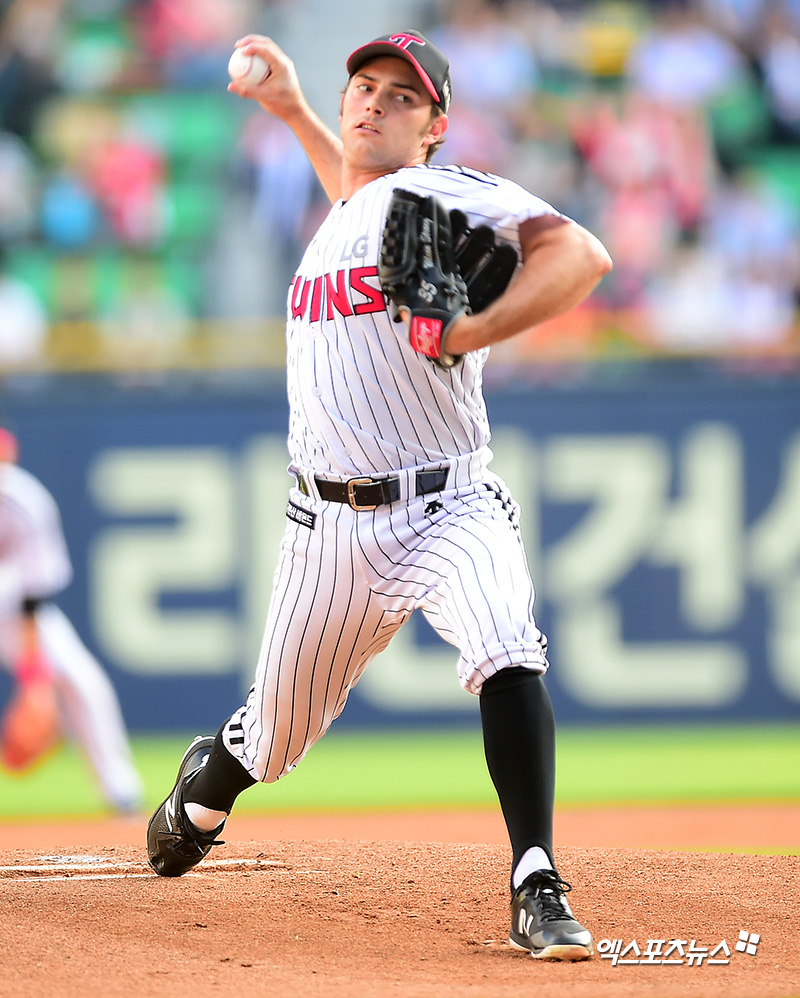 [엑스포츠뉴스 잠실, 김한준 기자] 15일 오후 서울 송파구 잠실야구장에서 열린 '2018 신한은행 MY CAR KBO리그' KIA 타이거즈와 LG 트윈스의 경기, 1회초 LG 선발투수 윌슨이 공을 힘차게 던지고 있다.