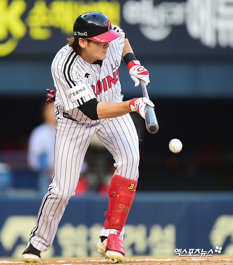 [엑스포츠뉴스 잠실, 김한준 기자] 16일 오후 서울 송파구 잠실야구장에서 열린 '2018 신한은행 MY CAR KBO리그' KIA 타이거즈와 LG 트윈스의 경기, 7회말 무사 1,2루 LG 이형종이 번트를 시도하고 있다.