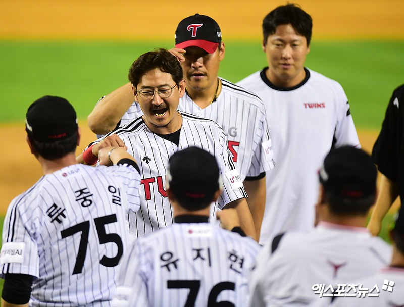 이날 경기에서 승리한 LG 선수들이 류중일 감독과 하이파이브를 하고 있다.