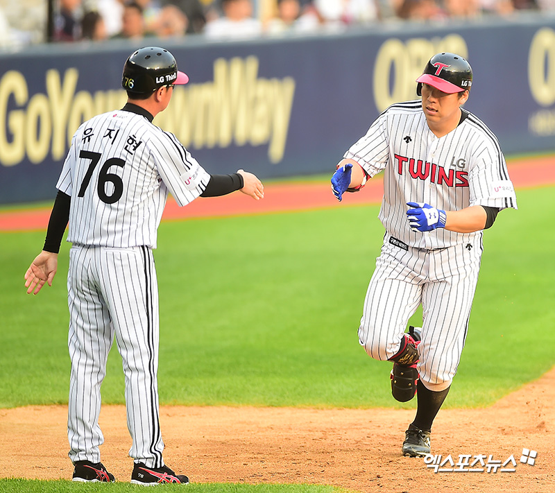 [엑스포츠뉴스 잠실, 김한준 기자] 23일 오후 서울 송파구 잠실야구장에서 열린 '2018 신한은행 MY CAR KBO리그' 롯데 자이언츠와 LG 트윈스의 경기, 3회말 2사 LG 김현수가 솔로 홈런을 날린 후 그라운드를 돌고 있다.