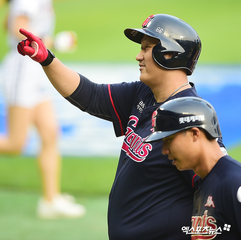 [엑스포츠뉴스 잠실, 김한준 기자] 23일 오후 서울 송파구 잠실야구장에서 열린 '2018 신한은행 MY CAR KBO리그' 롯데 자이언츠와 LG 트윈스의 경기, 4회초 무사 1,2루 롯데 이대호가 스리런 홈런을 날린 후 세리머니를 하고 있다.