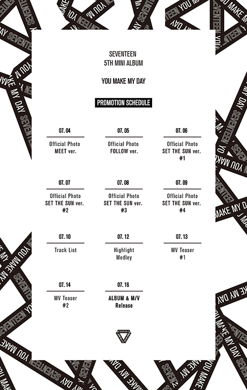소속사 플레디스 엔터테인먼트는 3일 자정 세븐틴의 공식 SNS 채널을 통해 오는 16일 발매될 미니 5집 앨범 ‘YOU MAKE MY DAY(유 메이크 마이 데이)’ 프로모션 스케줄을 공개하며 본격 컴백 카운트다운에 돌입했다.