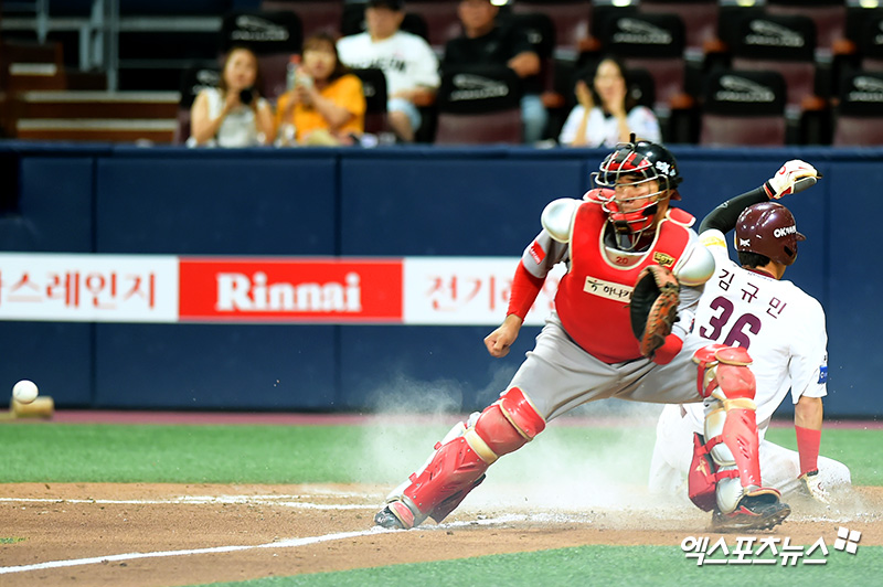 [엑스포츠뉴스 고척, 서예진 기자] 4일 오후 서울 고척동 고척 스카이돔에서 열린  '2018 신한은행 MY CAR KBO리그' SK 와이번스와 넥센 히어로즈의 경기, 5회말 1사 넥센 이택근이 적시타때 2루 주자 김규민이 슬라이딩으로 득점하고 있다​.