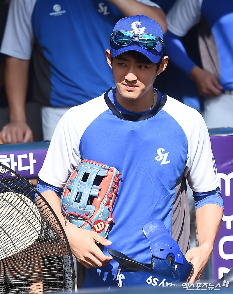 [엑스포츠뉴스 박지영 기자] 6일 오후 서울 송파구 잠실야구장에서 열리는 '신한은행 MY CAR KBO리그' 삼성 라이온즈와 두산 베어스의 경기에 앞서 삼성 구자욱이 훈련을 위해 그라운드로 나서고 있다.
