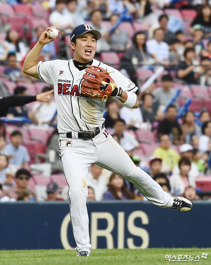 [엑스포츠뉴스 박지영 기자] 6일 오후 서울 송파구 잠실야구장에서 열린 '신한은행 MY CAR KBO리그' 삼성 라이온즈와 두산 베어스의 경기, 2회초 1사 두산 허경민이 삼성 구자욱의 타구를 잡았으나 1루로 송구하지 못하며 출루시키고 있다.