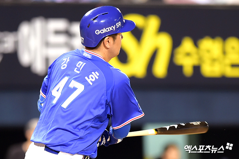 [엑스포츠뉴스 잠실, 서예진 기자] 8일 오후 서울 송파구 잠실야구장에서 열린 '2018 신한은행 MY CAR KBO리그' 삼성 라이온즈와 두산 베어스의 경기, 6회초 2사 1,2루 삼성 강민호가 1타점 2루타를 날리고 있다.