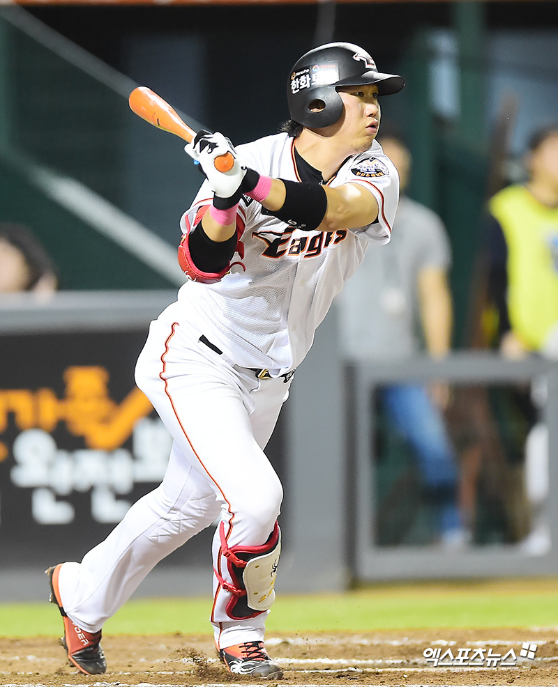 [엑스포츠뉴스 대전, 김한준 기자] 12일 오후 대전광역시 중구 한화생명이글스파크에서 열린 '2018 신한은행 MY CAR KBO리그' 넥센 히어로즈와 한화 이글스의 경기, 6회말 무사 1루 한화 하주석이 우전안타를 날리고 있다.