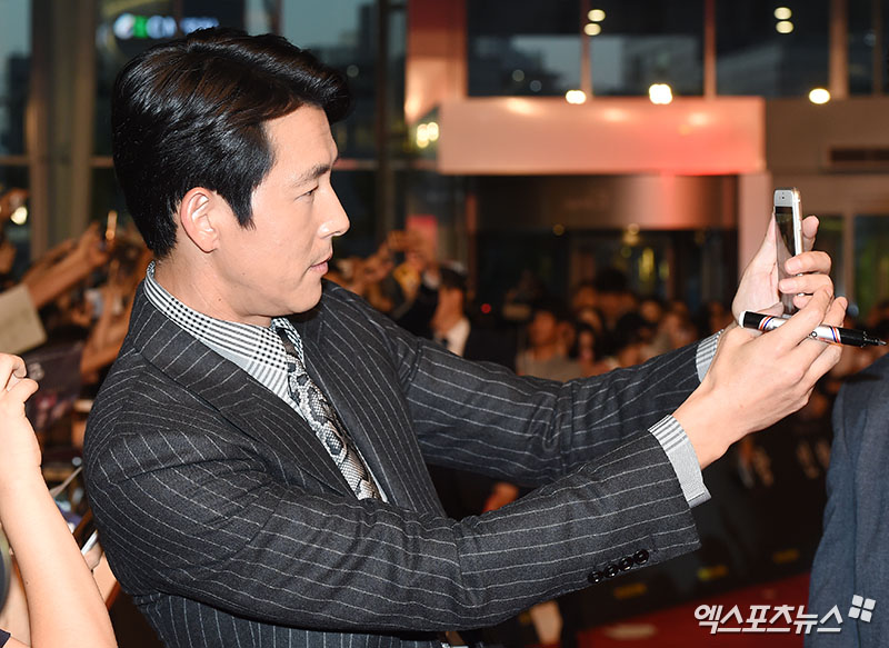 [엑스포츠뉴스 박지영 기자] 18일 오후 서울 영등포구 타임스퀘어에서 열린 영화 '인랑' 레드카펫 행사에 참석한 배우 정우성이 팬의 셀카 요청에 응하고 있다.