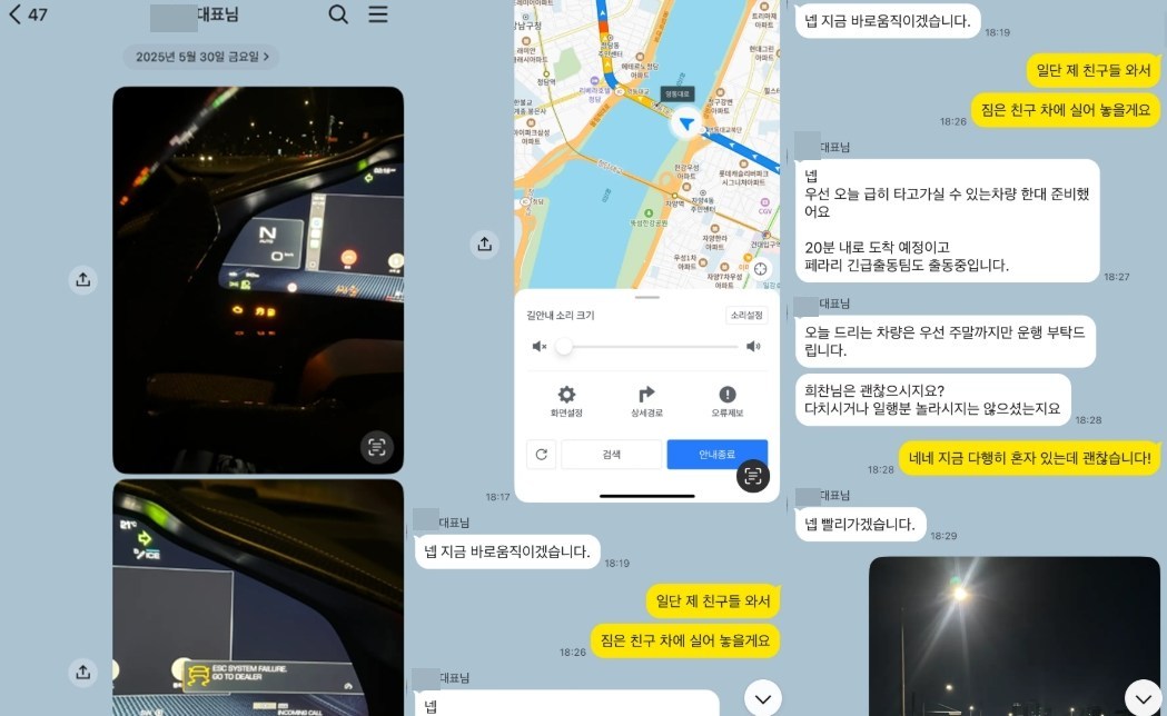 차량 경고등 원인에 대해 김 대표는 “기름이 없었다. 푸로산게는 12기통이라 기름 한 칸 남을 때까지 두면 안되는 것 같습니다. 저도 이번에 배웠네요.” 라고 설명하였음.