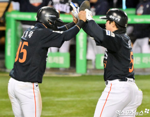 노시환 '짜릿한 홈런 하이파이브'[포토]
