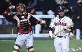 헛스윙 삼진으로 물러나는 박세혁[포토]