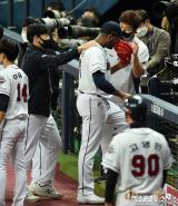 허경민, 어지럼증으로 4회 교체 [PO3:온에어]
