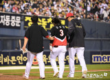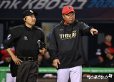 박계범 타석 상황에 대해 어필하는 이범호 감독[포토]