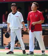 류중일 감독-최형우 '날이 뜨겁네요~'[포토]