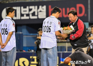 신언 선수들에게 꽃다발 전달하는 차명석 단장[포토]