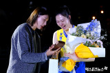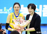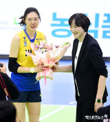 '은퇴' 양효진에게 꽃다발 전하는 장소연 감독[포토]