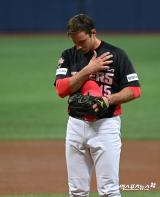 멩덴 '투구 전 성호를 긋고'[포토]
